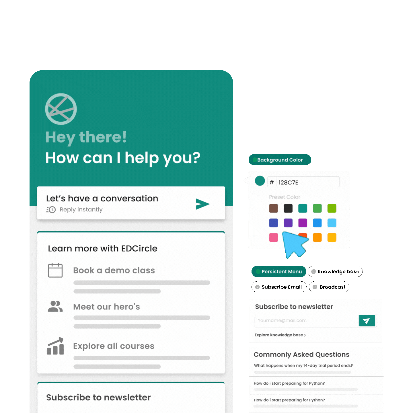 Powerful application suite to enhance chatbot functionality, including a Persistent Menu for easy navigation, Broadcast Messaging for effective broadcasting and a inbuilt Knowledge Base for addressing common user inquiries.